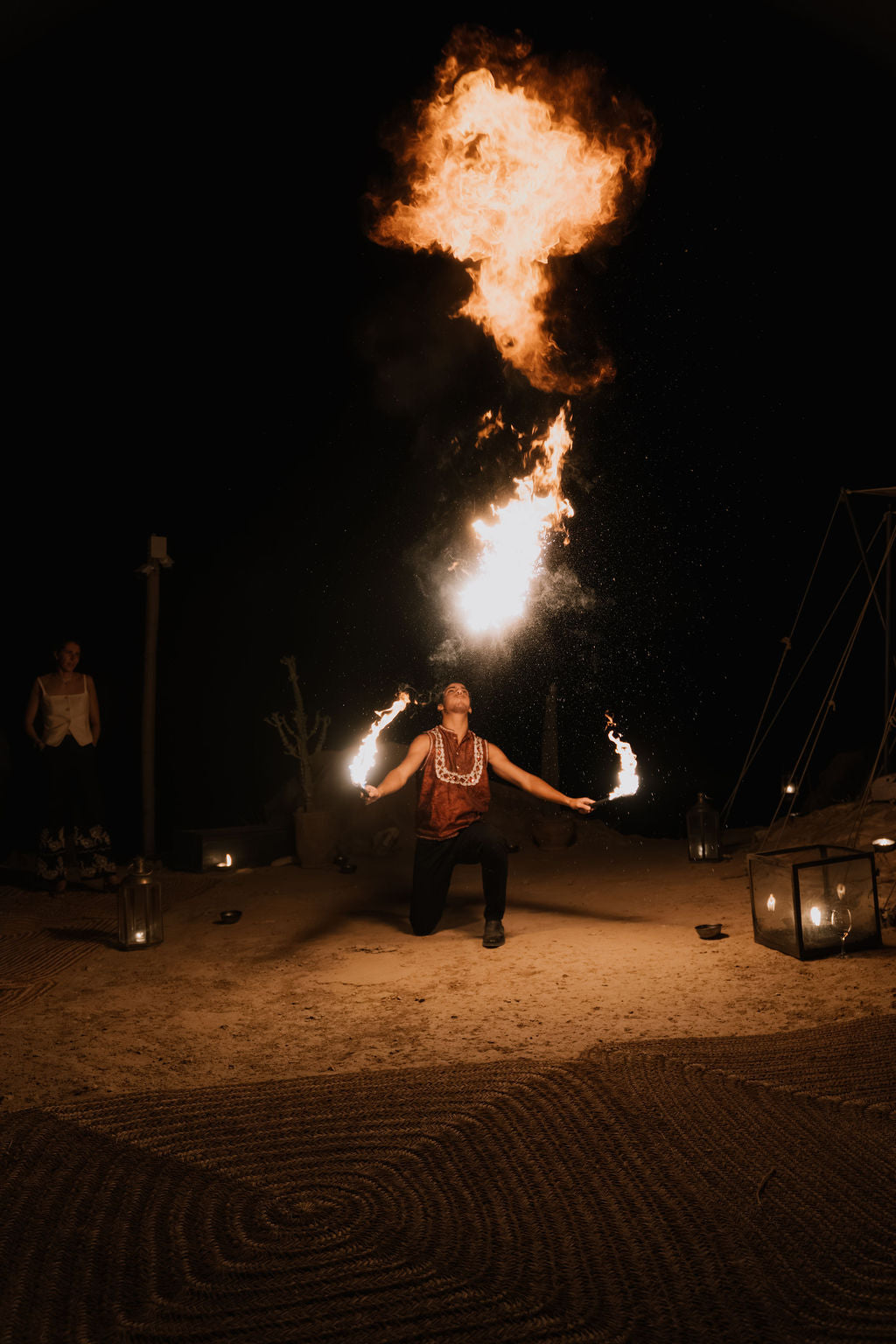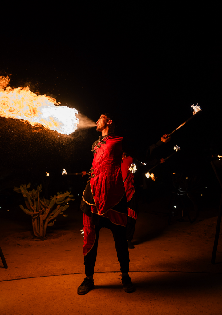 Our fire spinners are skilled in the art of fire manipulation, creating stunning visual displays with spinning, twirling, and juggling flaming props. Our fire spinners are seasoned performers with extensive training and experience in fire arts.