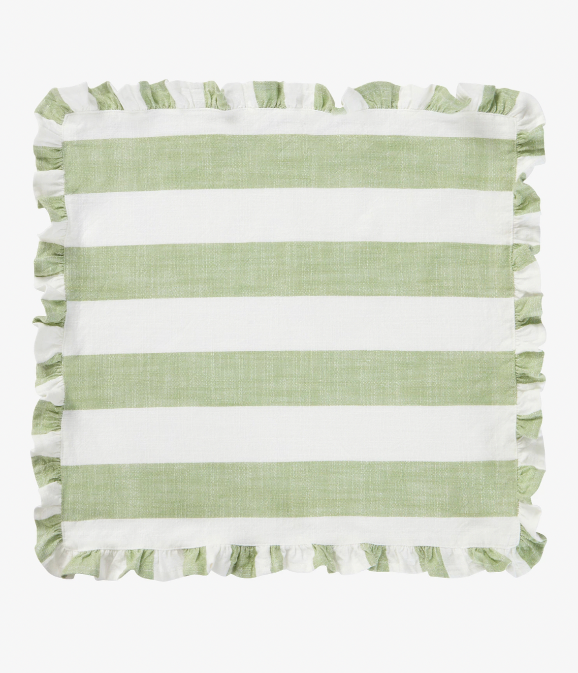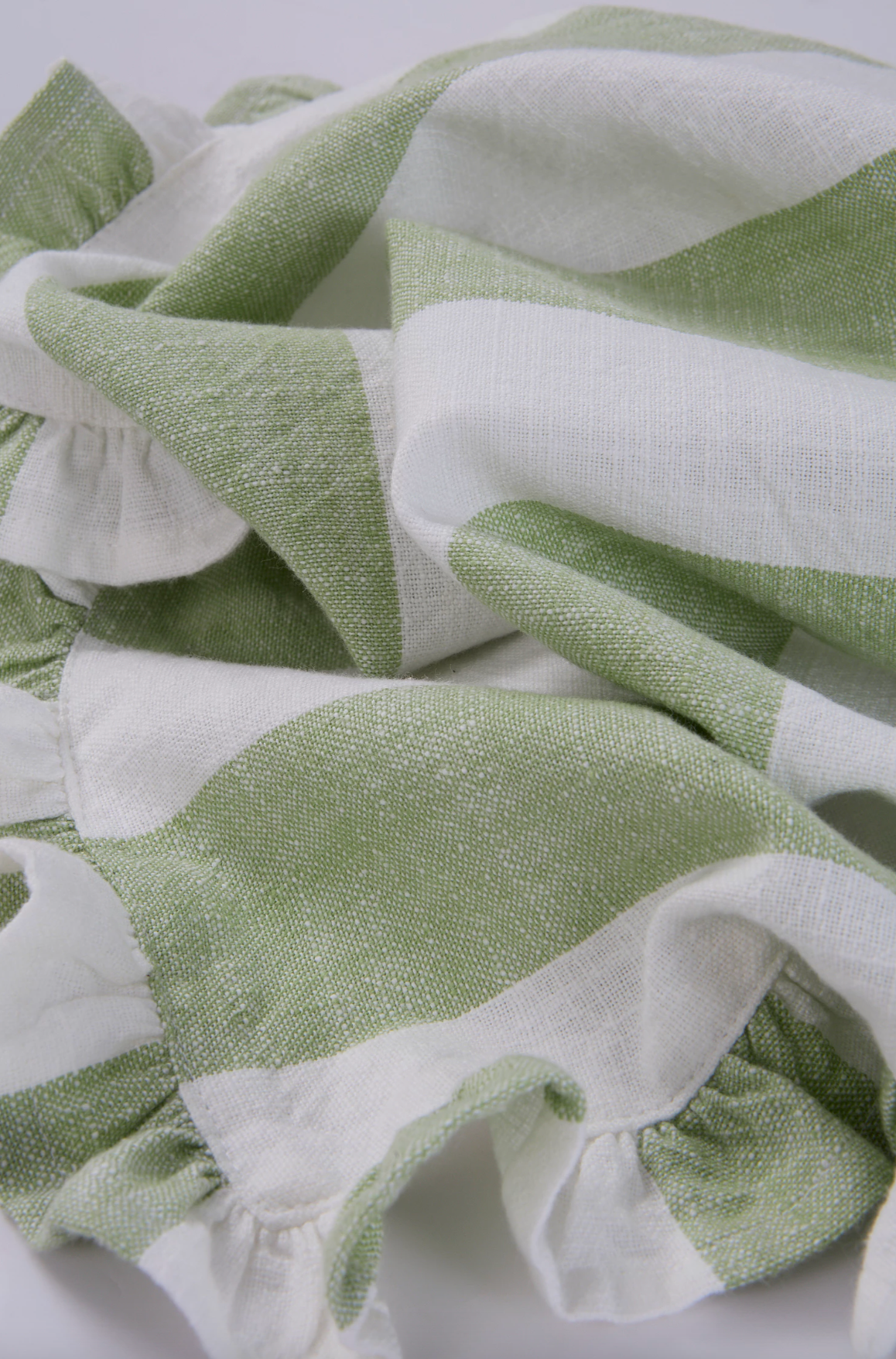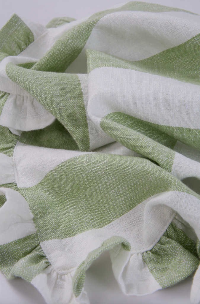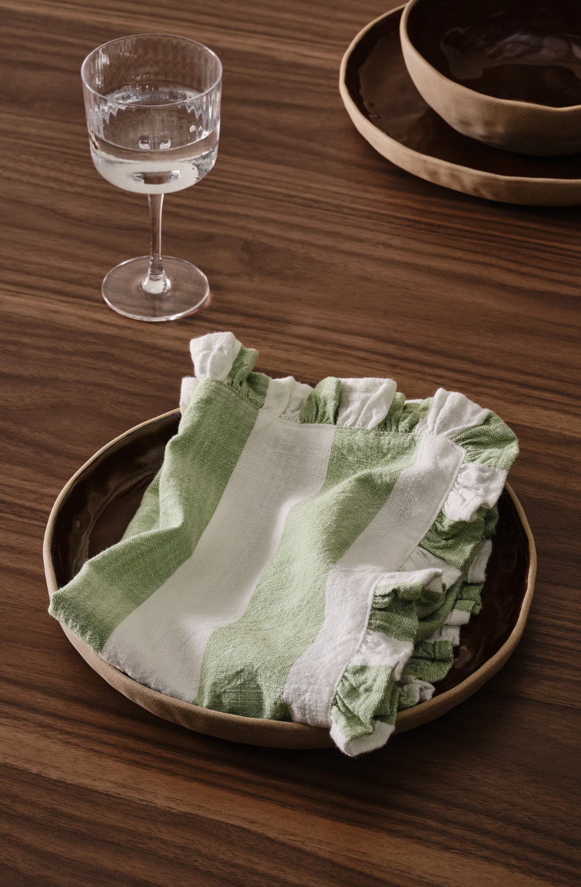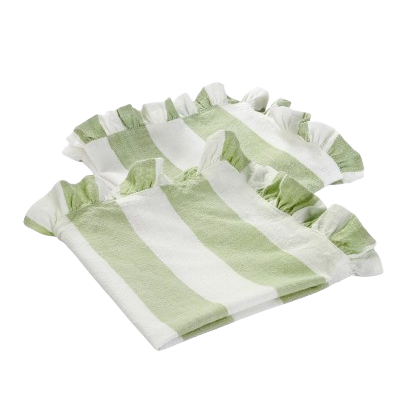 The DELLA napkin features a charming ruffled edge and a timeless yarn-dyed green and white stripe pattern, bringing a touch of elegance to any setting. Made from soft, high-quality cotton, these napkins combine comfort with refined style, making them an effortless addition to both casual and elevated table designs.