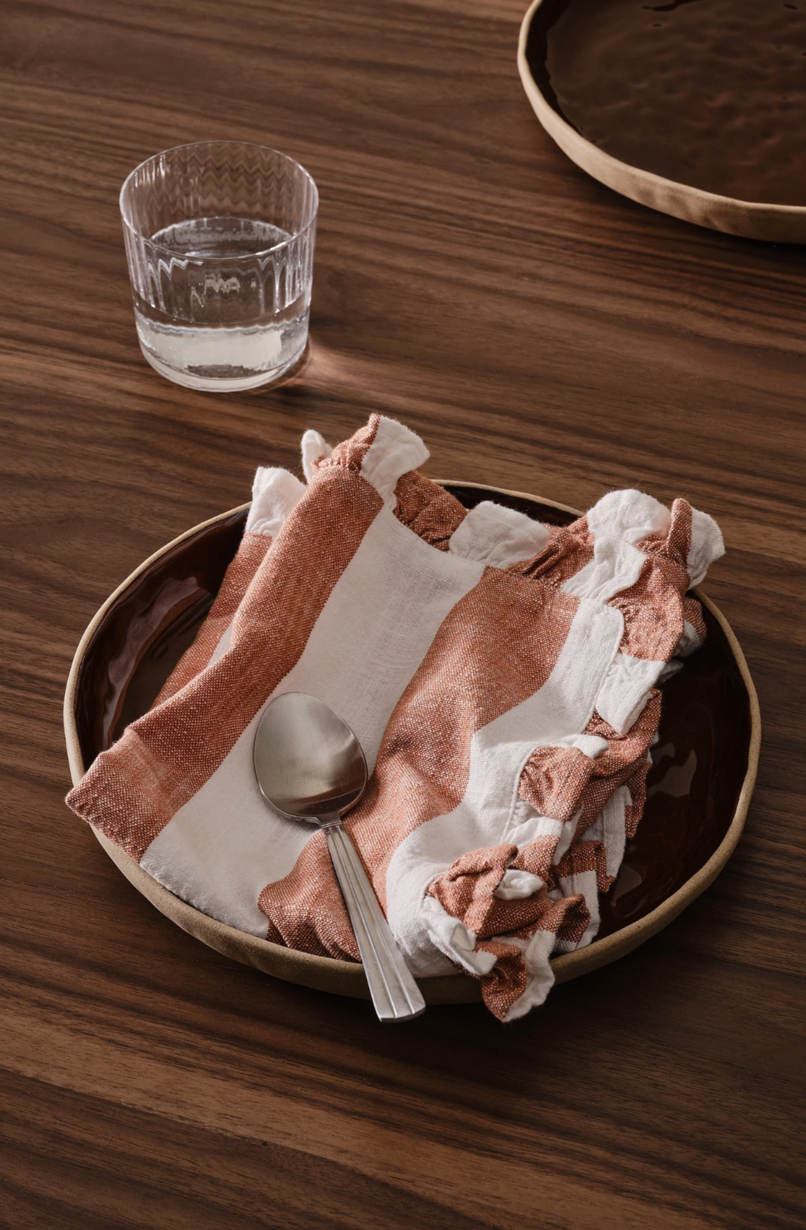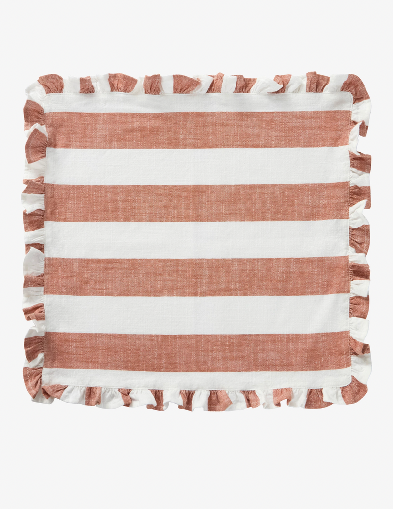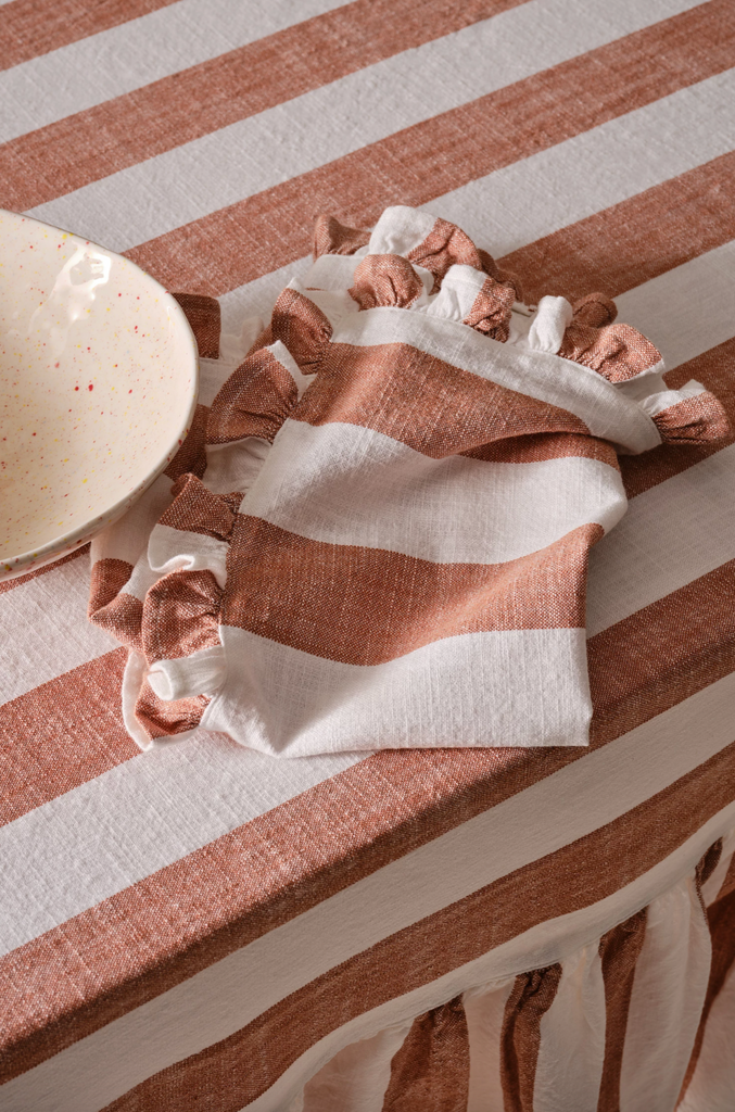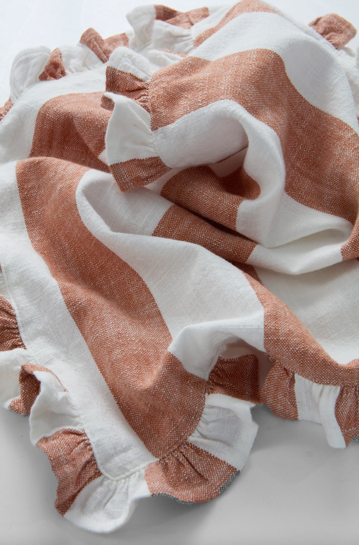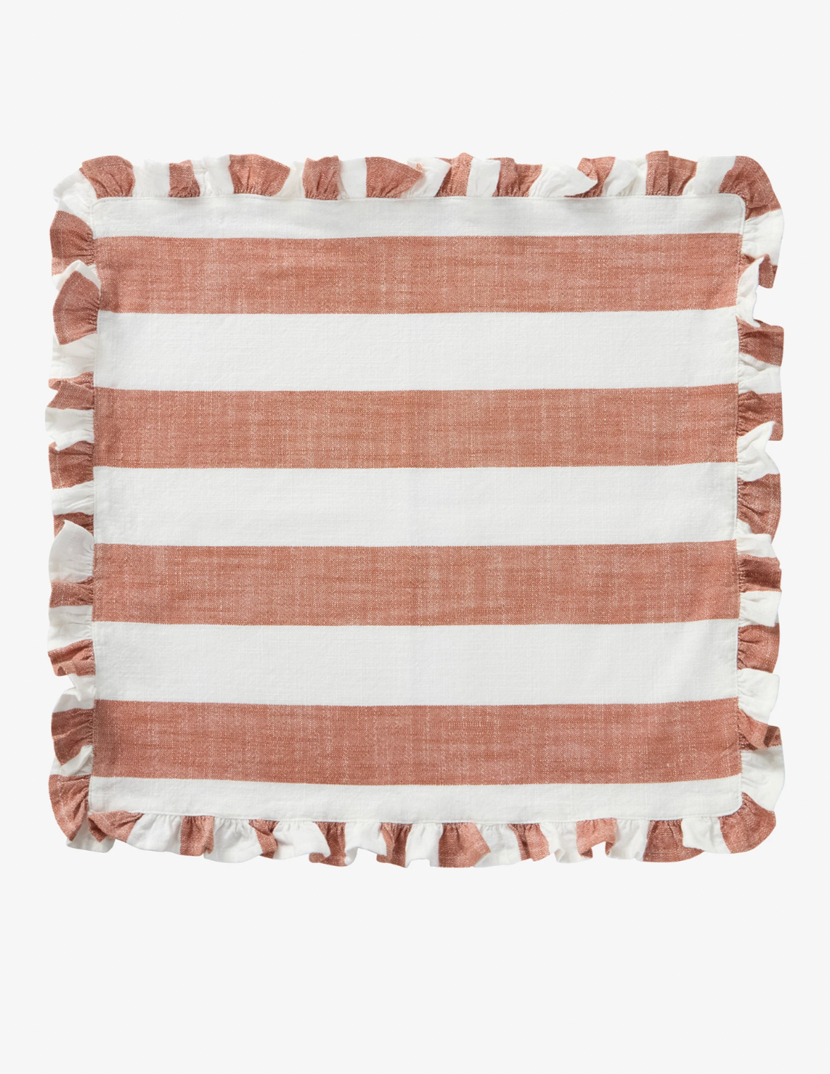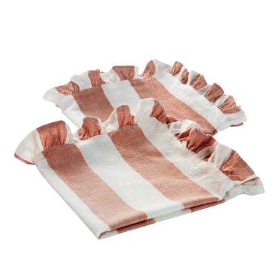The JONIE napkin features a charming ruffled edge and a timeless yarn-dyed yellow and white stripe pattern, bringing a touch of elegance to any setting. Made from soft, high-quality cotton, these napkins combine comfort with refined style, making them an effortless addition to both casual and elevated table designs.